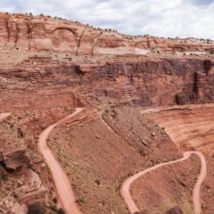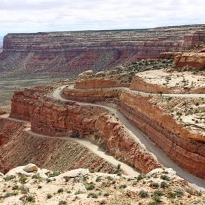 Moki Dugway is a three-mile drive situated between Cedar Mesa and Mexican Hat in southeastern Utah, connecting Highways 95 and 163. This highway carved from the face of a cliff was created for truck drivers hauling ore. The unpaved switchback highway goes proper up the facet of a mountain at an 11% grade with no guardrail.