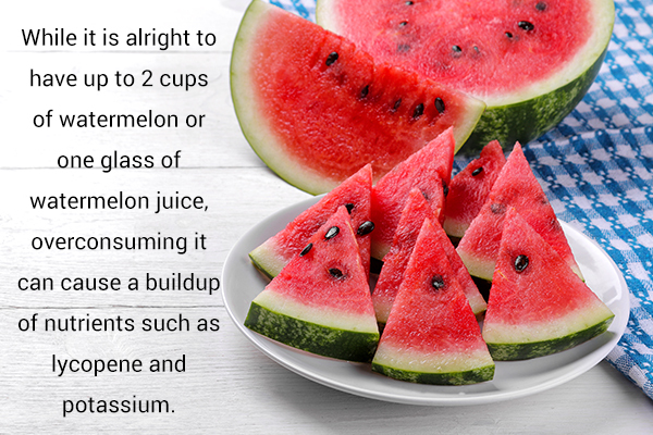 - Whereas it’s alright to have as much as 2 cups of watermelon or one glass of watermelon juice, overconsuming it will possibly trigger a buildup of vitamins similar to lycopene and potassium. A big amount of potassium can disrupt your electrolyte stability and kidney perform. A considerable amount of fiber obtained from overeating watermelon also can trigger digestive misery similar to bloating, diarrhea, and nausea.