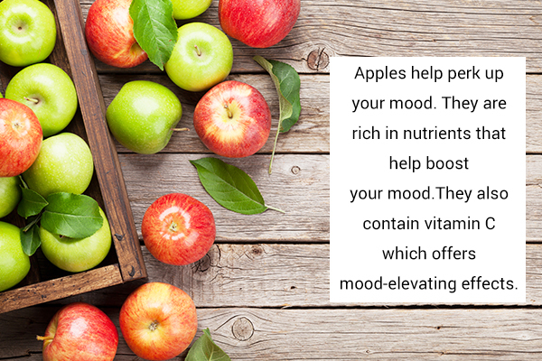 Apples help perk up your mood. They are rich in nutrients that help boost your mood. (15) They also contain vitamin C which offers mood-elevating effects. (16)