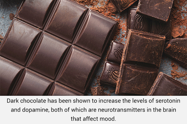 Dark chocolate has been shown to increase the levels of serotonin and dopamine, both of which are neurotransmitters in the brain that affect mood. (2)