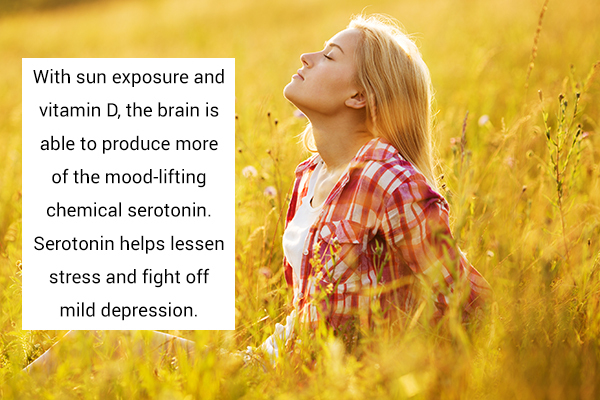 With sun exposure and vitamin D, the brain is able to produce more of the mood-lifting chemical serotonin. (22) Serotonin helps lessen stress and fight off mild depression. (23) It has been suggested that combining exercise (see number 8 on our list) with sunlight may be even more beneficial in elevating your mood. (21)