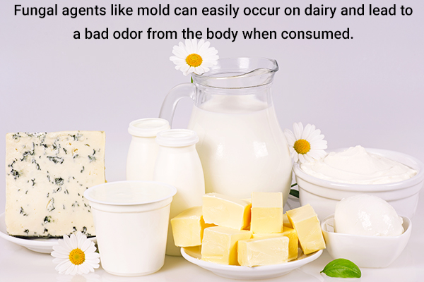 Dairy, when broken down by the body, produces hydrogen sulfide, which has a very powerful rotten eggs smell. Also, fungal agents such as mold can easily proliferate on dairy and can lead to a bad odor emanating from the body when consumed. Avoid eating dairy products that have been stored for too long. (18)