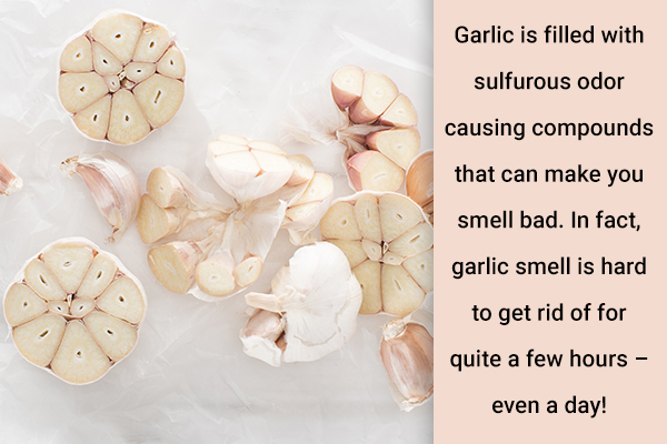 Garlic is filled with sulfurous odor-causing compounds that can make you smell bad. In fact, garlic smell is hard to get rid of for quite a few hours – even lasting a day!