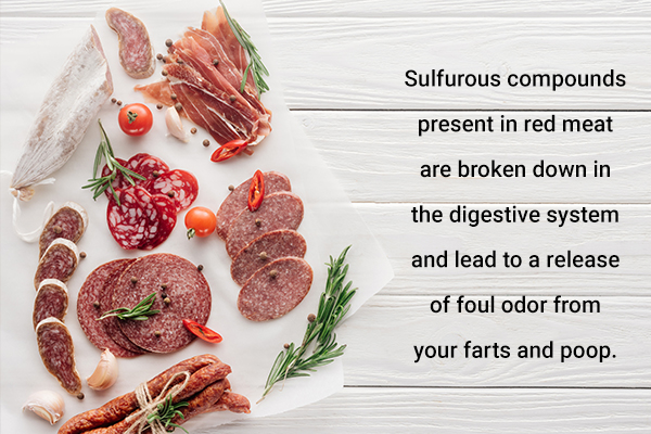 Red meat also contains lots of sulfurous compounds. These compounds are broken down in the digestive system and can lead to a release of foul odor from your fart and poop.