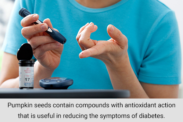 Pumpkin seeds contain compounds with antioxidant action that is useful in reducing the symptoms of diabetes. Pumpkin fruit is recommended for people with diabetes. (5)
