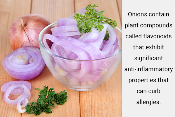 Onions comprise plant compounds known as flavonoids that exhibit important anti-inflammatory properties that may curb allergic reactions. The most effective flavonoids on this regard are quercetin and its conjugates, that are abundantly present in onions. (12)(13)
