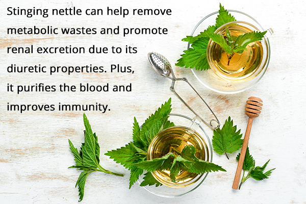 Stinging nettle might help take away metabolic wastes and promote renal excretion because of its diuretic properties. Plus, it purifies the blood and improves immunity. (3)(4)