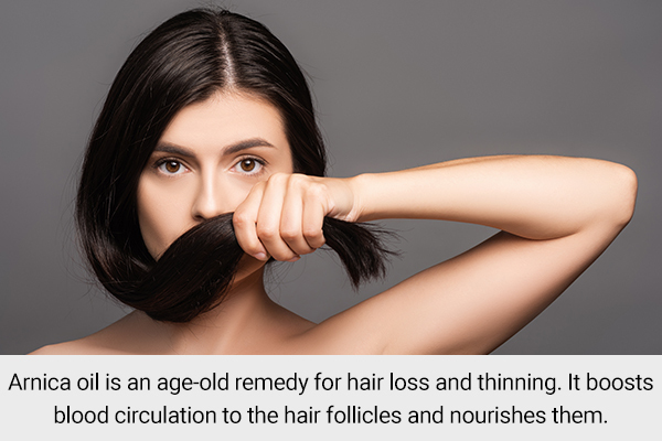 Arnica oil is an age-old treatment for hair loss and thinning. It boosts blood circulation to the hair follicles and nourishes them. Arnica additionally helps cleanse the scalp of particles and extra oil, thus rejuvenating it. (7)