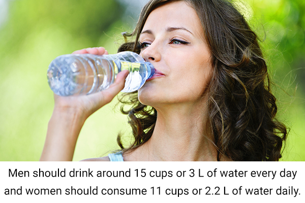 Men should drink around 15 cups or 3 L of water every day and women should consume 11 cups or 2.2 L of water daily. (15)