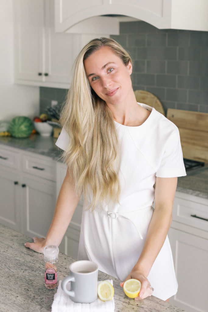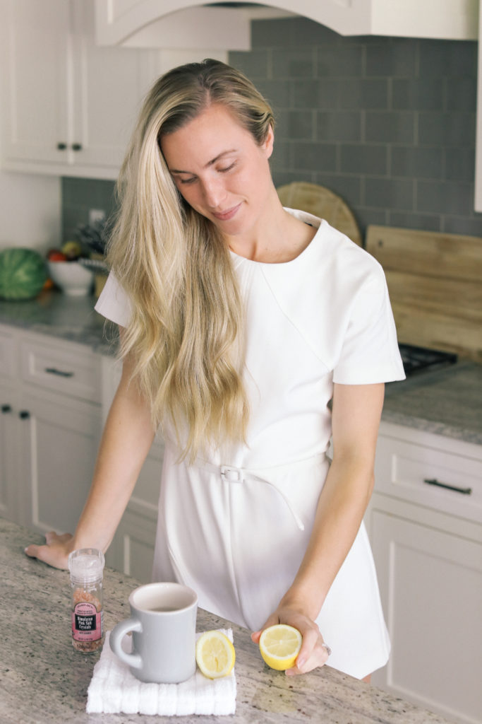 Lemon water gets your digestion going, boosts immunity, and aids in detoxification. Pink salt adds essential minerals and helps stimulate enzymes that aid in digestion. My trainer at Stark told me that natural salt has been used for skin issues since the ancient Roman times, which is incredible to think about.