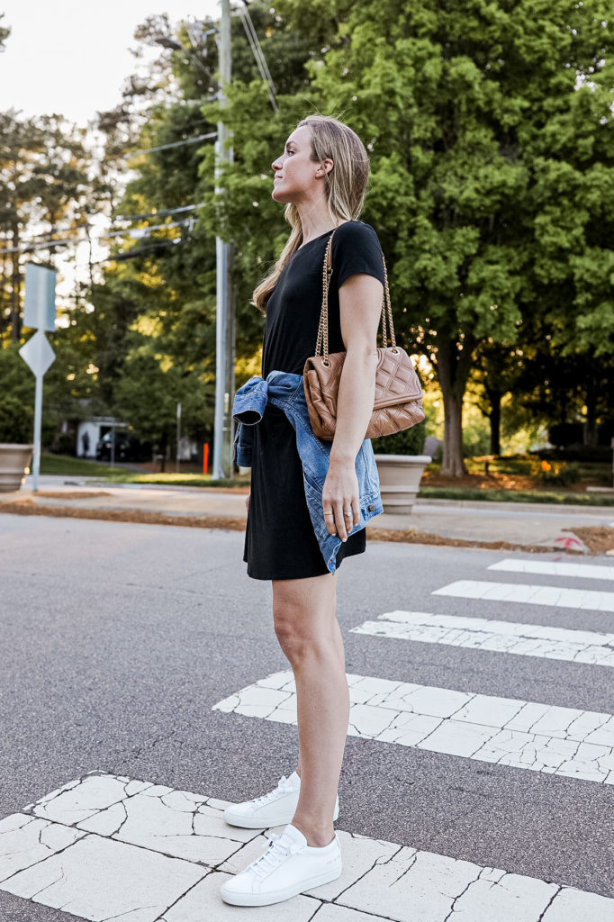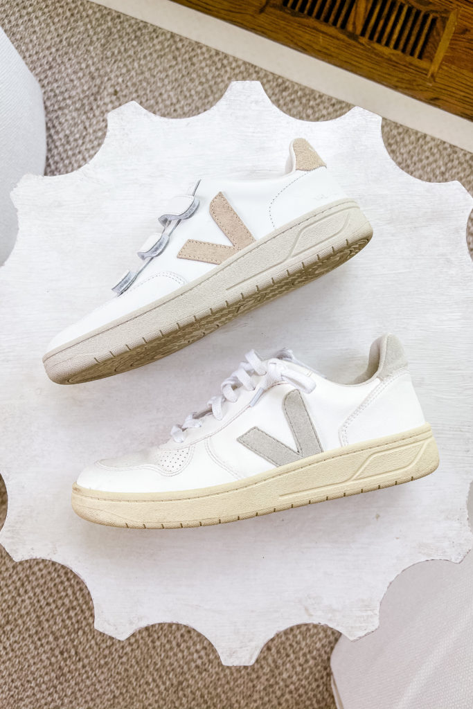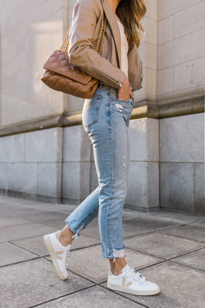 The Frame jeans run small—size up! Seen on me here with sneakers, but I wore them in the fall with booties and they work well with sandals, too. They’re definitely a year-round-friendly pair.