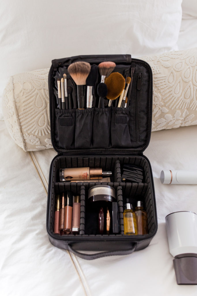 Things I know for sure are coming with me are my skin care, makeup, and hair tools. This cosmetic travel case (size medium) is the best $25 spent—it holds all my makeup, including my brushes. I usually store my perfume bottle in there as well to keep it from breaking during travel. I use this case for my Dyson hair dryer and these zippered cases for skin care and toiletries.